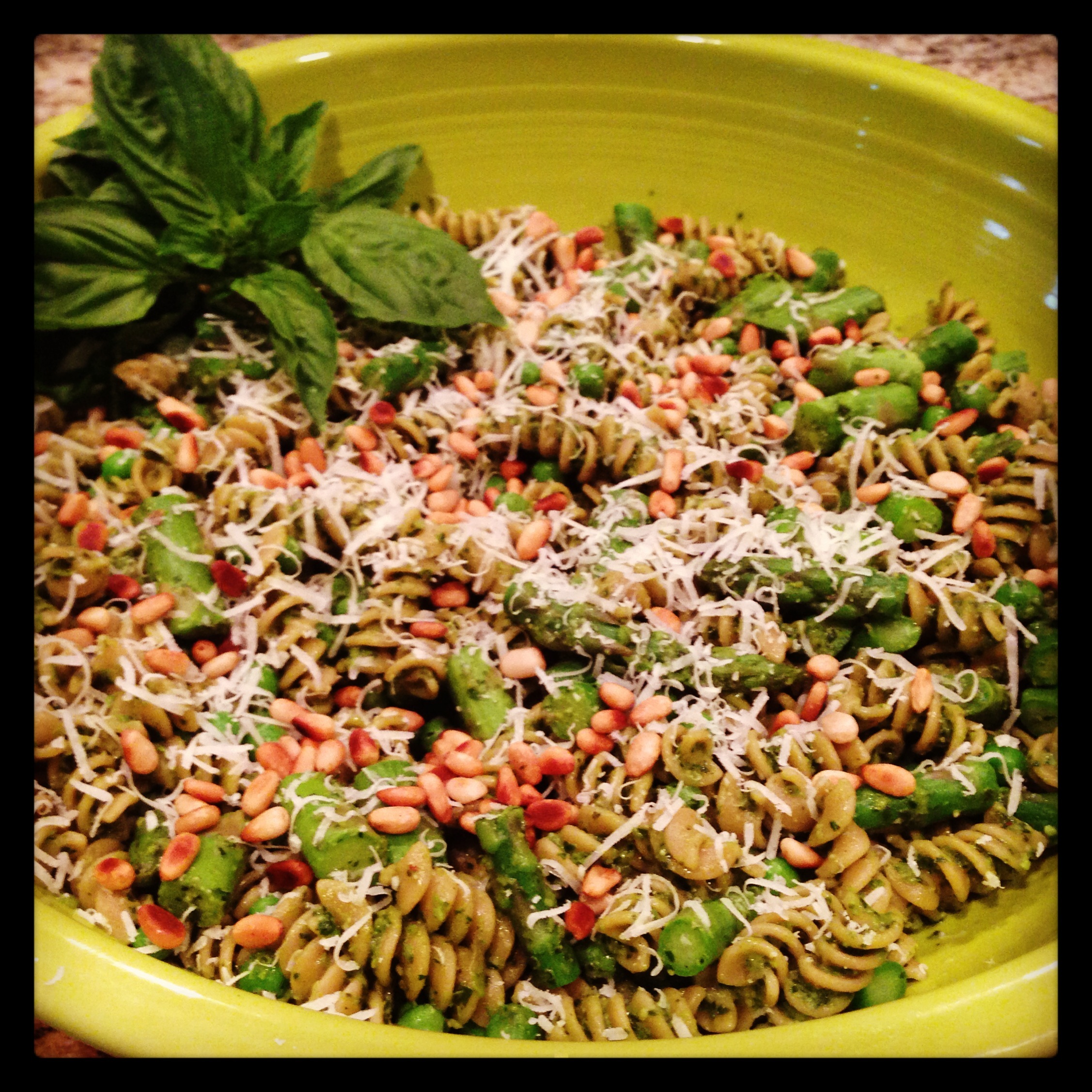 I love to make this pasta in the springtime when the asparagus and the English peas are at their peak. This pasta dish is not only a beautiful shade of spring green it also packs a healthy and hardy punch. When I make pesto for this pasta dish I prefer whole-wheat rotini pasta. The nutty flavor of the whole wheat pasta compliments the strong basil and garlic flavors in the pesto, add in the crisp asparagus, the sweet peas, and a few extra toasted pine nuts and you have a quick and easy meal that I guarantee you will make again and again.