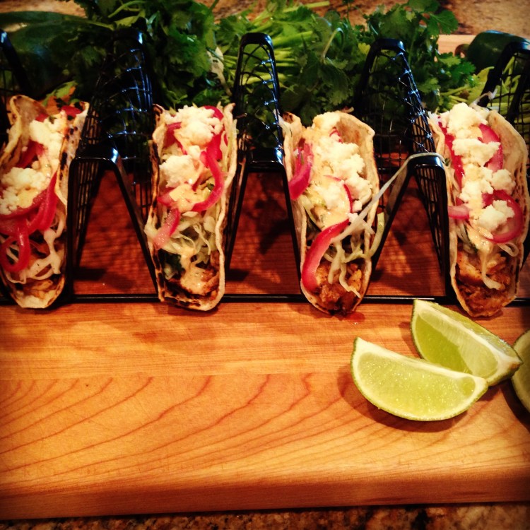 My fish tacos are lighter than the ones you might typically get in Mexico because I don’t deep-fry my fish. Instead I use a delicious spice rub (Chili Lime Rub) that I get from Williams and Sonoma, then I sauté my fish filets in my cast iron skillet. As soon as the fish comes out of the hot skillet I hit it with a squeeze of fresh lime juice then I cover it with foil and let the fish rest while I heat up my tortillas. Then I fill my charred corn tortillas with the fish, a little shredded cabbage slaw, my chipotle sauce, pickled red onions, and a little crumbled queso fresco. My fresh and spicy fish tacos will transport you directly to a beach in Mexico in just one bite. I can hear the waves now…