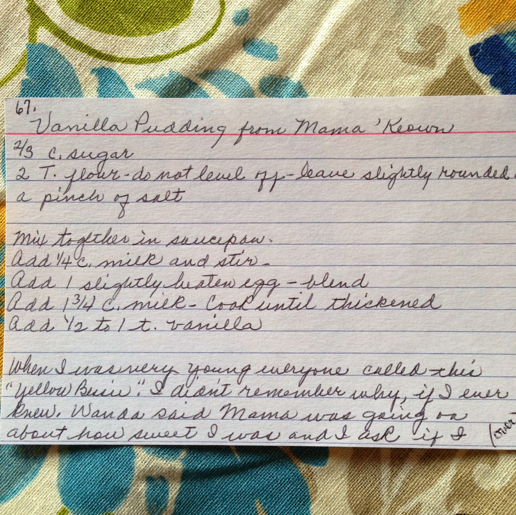 A few days later I received a letter and a recipe in the mail. This Vanilla Pudding Recipe was the first recipe of my Great Grandmother’s, Mama’ Keown, I ever got. My Grandmother, Bessie, can sill remember her Mother making this Vanilla Pudding from the time she was a little girl. So this recipe at least dates back to the 30’s.