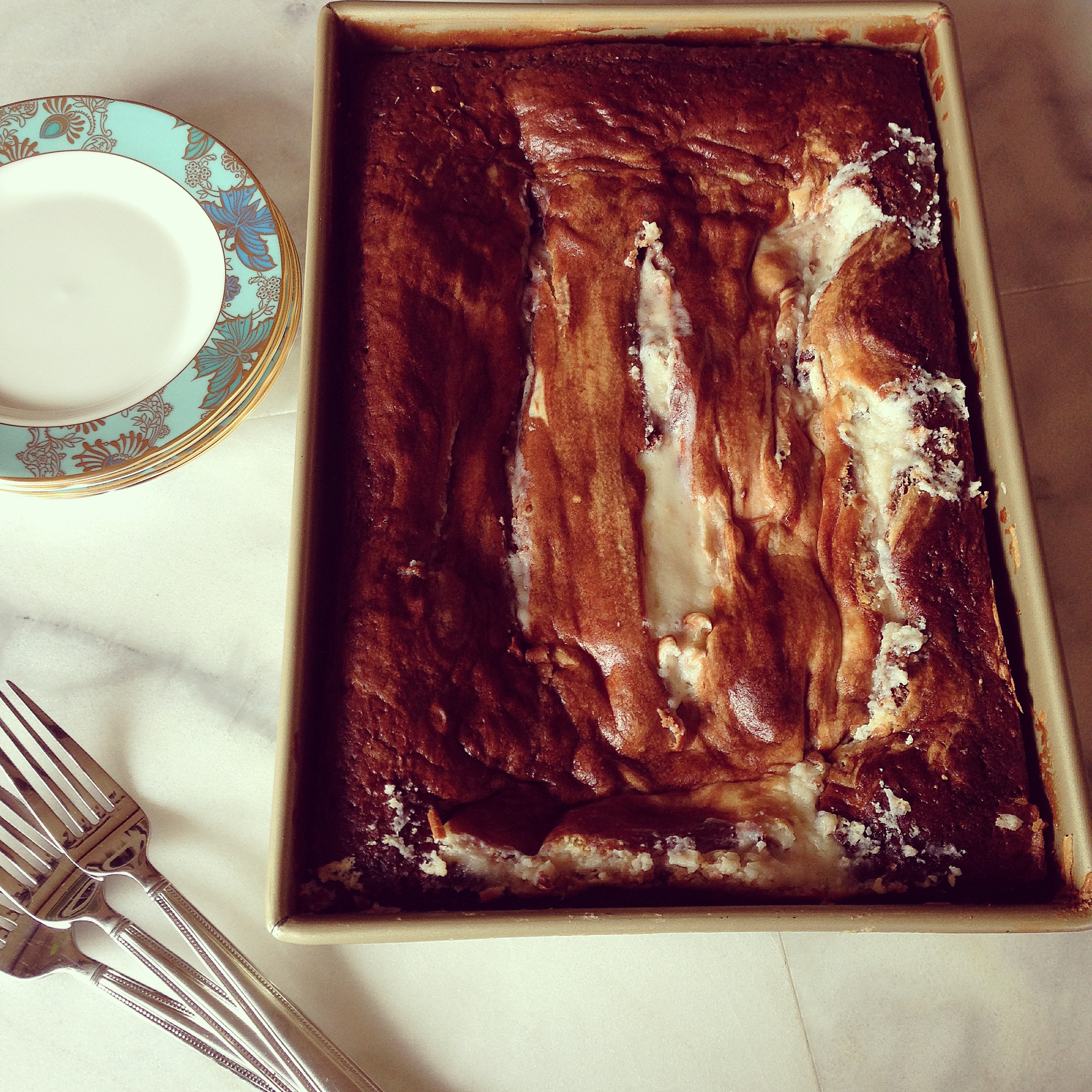 Using a hand mixer mix together the softened cream cheese, butter, vanilla and powdered sugar until fluffy then pour on top of the cake mix and swirl in with a knife, creating a marbled look.