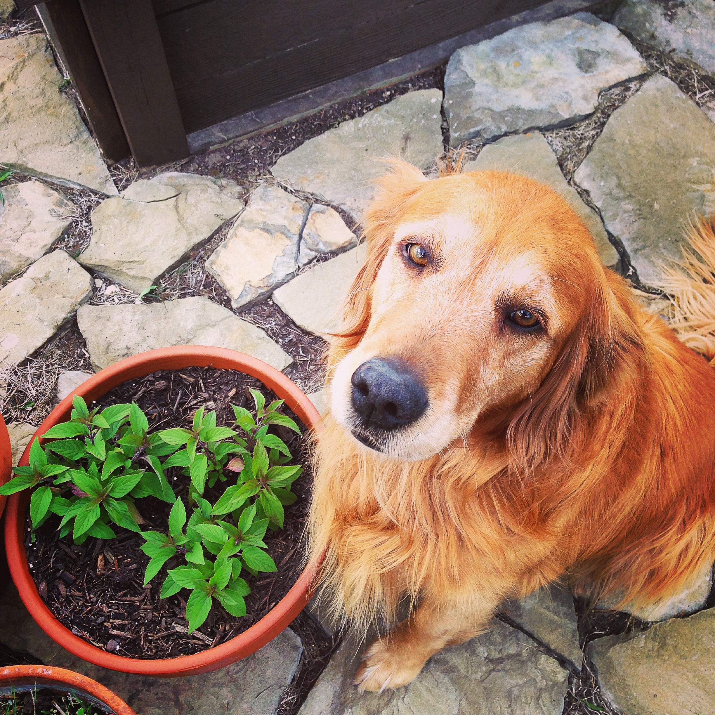 This is another one of my favorite herbs Pineapple Sage, it will grow into a pretty little bush with little red flowers by fall. Not only do the leaves smell just like pineapple but the beautiful little red flowers attract hummingbirds. Miley, my Garden Guard Dog, wanted to be in the picture too : )