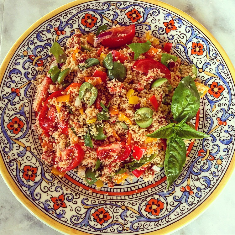 But no matter how much I click my heels together and wish for cool October weather it’s still HOT and it’s still August. So how do I beat this 104 degree Texas heat? With my Italian Couscous Summer Salad….