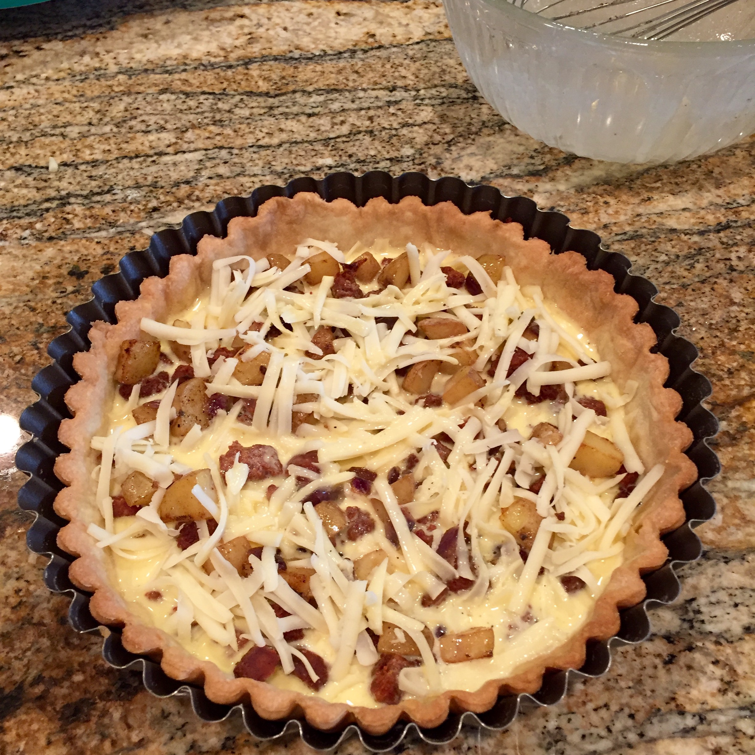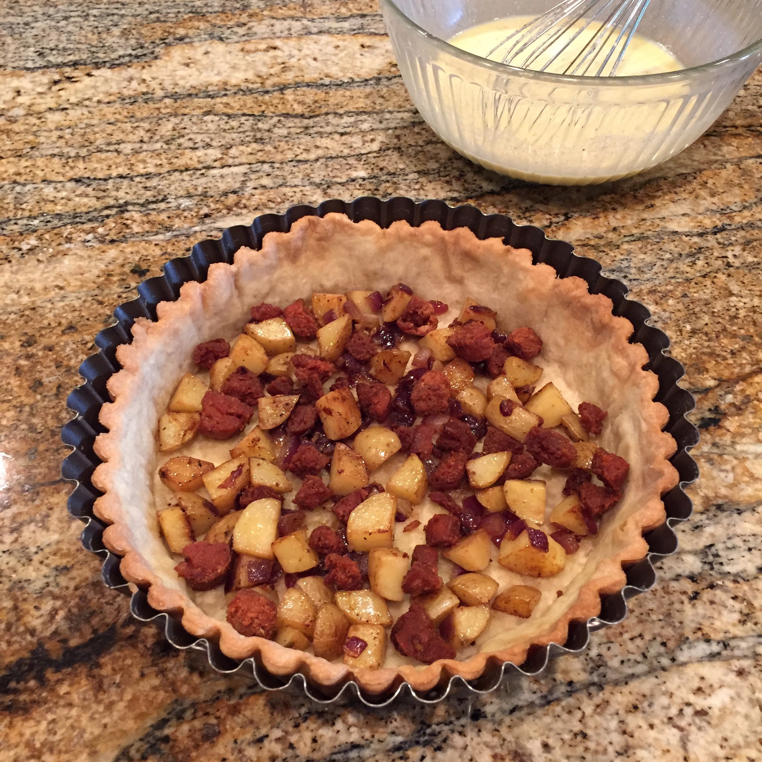 Add half the chorizo, potatoes, and cheese to the cooled pie shell then pour over half the egg mixture.FullSizeRender