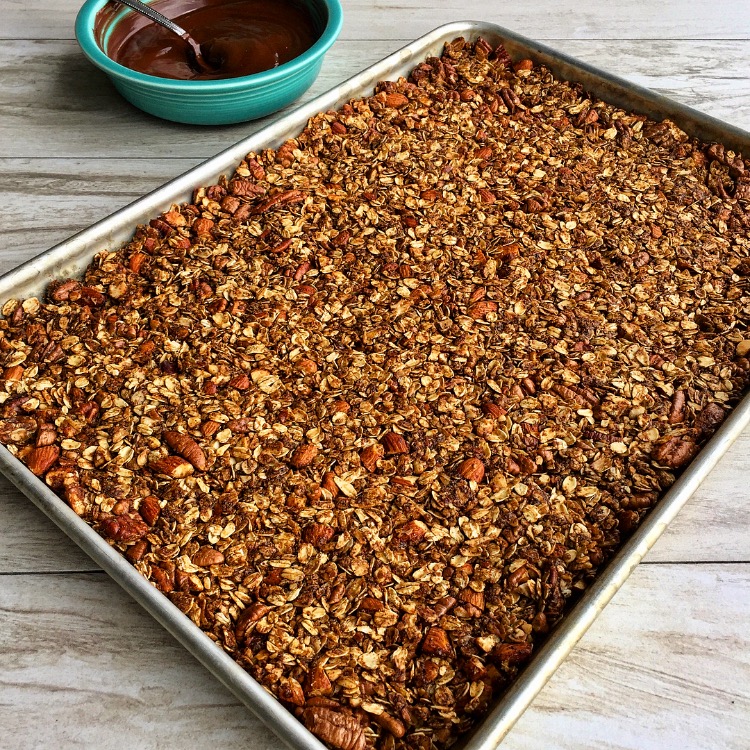 I need to make a coffee flavored granola and since nothing goes with coffee better than chocolate lets drizzle that coffee granola with a DARK CHOCOLATE. I’ll call it Café Mocha Granola.