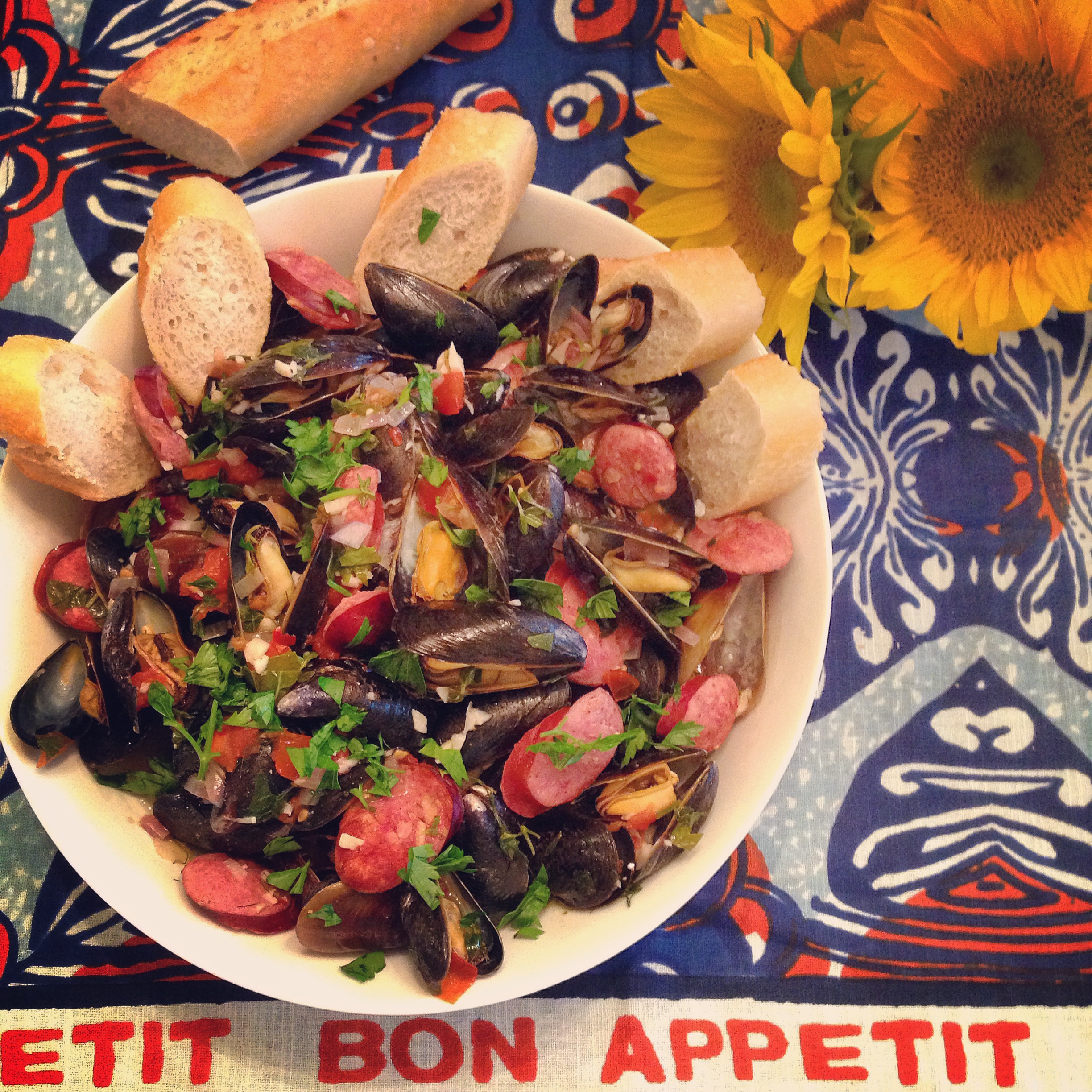 Mussels With Spicy Bacon Sausage In White Wine Sauce